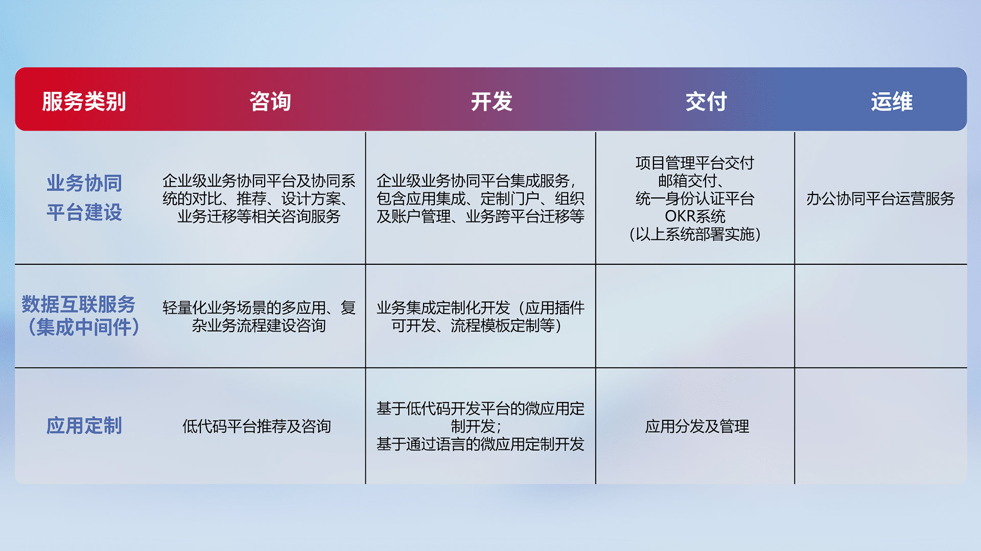 针对钉钉、、、、企微、、、IDaas等平台级产品提供产品的规划、、、、方案、、、交付、、、、定制化开发等服务,,,实现如统一协同办公、、、智能客户服务、、、混合会议管理、、智能数据查询、、、等业务场景,,,,实现数字化转型。。